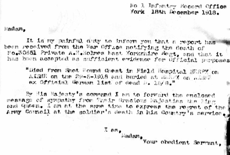 Their stories are all different but they all shared the prospect of growing up without their natural father. Sometimes confirmation of that life-changing fact came in a simple letter sent to their mother like this one sent to Lilian Holmes, the widow of Alfred and mother of Martha, Mary and Stephen.